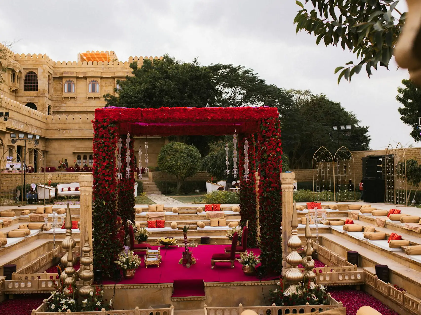 Beautifully styled setups with floral arrangements, drapes, and lighting designed to create a luxurious and visually stunning ambiance.